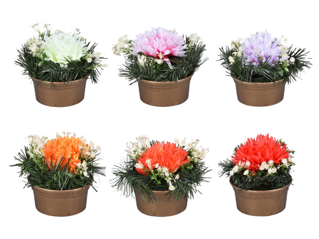 Umělá aranže z květin imitujících chryzantémy a šater v kombinaci s umělou jehličinou. Vsazená do plastového květníku, který je zatížen, což napomáhá proti převržení či odfouknutí větrem. Bezvadně se hodí pro podzimní dekoraci, zejména pietních míst. Materiál: textil, plast. Velikost aranžmá: 17 cm. Barva: květy - barevný mix fialové, červené, světle oranžové, oranžové, růžové a bílé, miska - zlatohnědá.