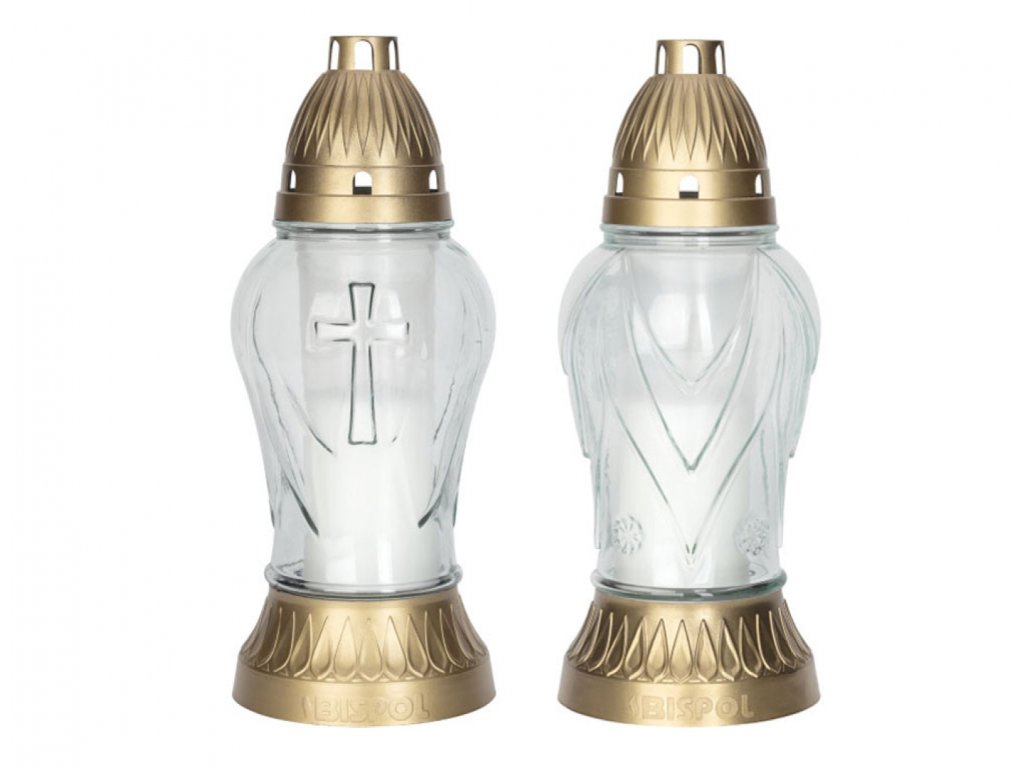 Skleněná hřbitovní lampa v mixu dekorů (kříž, andělská křídla). Podstavec a víčko ve zlaté barvě.