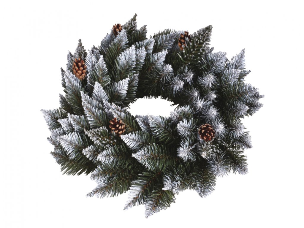 Umělý zimní věneček. Jehličnaté větvičky jsou dekorovány bílými konci a borovými šiškami v přírodní barvě. Mnohostranné využití. Vhodný k dozdobení. Kruhového tvaru. Průměr: 40cm. Barva: zelená-bílá.