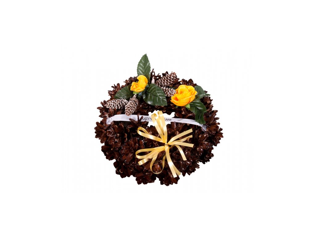 Hřbitovní věnec o průměru korpusu 20cm. Na korpusu jsou po celé ploše připevněny lakované borové šišky. Přízdobu tvoří aranžmá z červených umělých růžiček s umělými zelenými lístky. Na protilehlé straně přízdoby je umělá růžová decentní mašlička. Přes celou šířku věnce vede tenká bílá stužka s nápisem: "VZPOMÍNÁME".